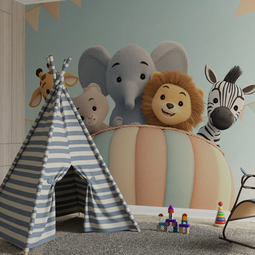 KidsWallStap aan boord voor een betoverende reis met dit kinderbehang dat een vrolijke luchtballon omringd door prachtige dieren illustreert. Een beer, een...