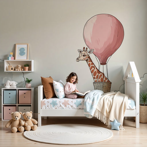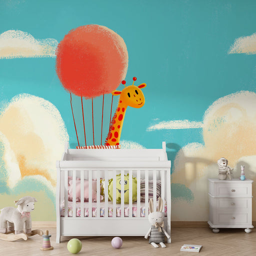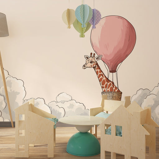 KidsWallStap aan boord voor een denkbeeldige reis door de kamer van uw kind met dit charmante kinderkamerbehang met een vrolijke giraffe die reist in een k...