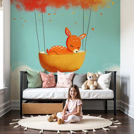 KidsWallStap in een magisch avontuur in de kamer van je baby met dit babykamerbehang, waar een egel en een vos worden meegenomen door kleurrijke ballonnen ...