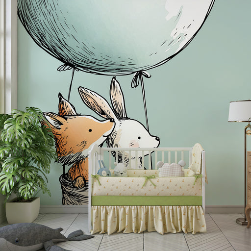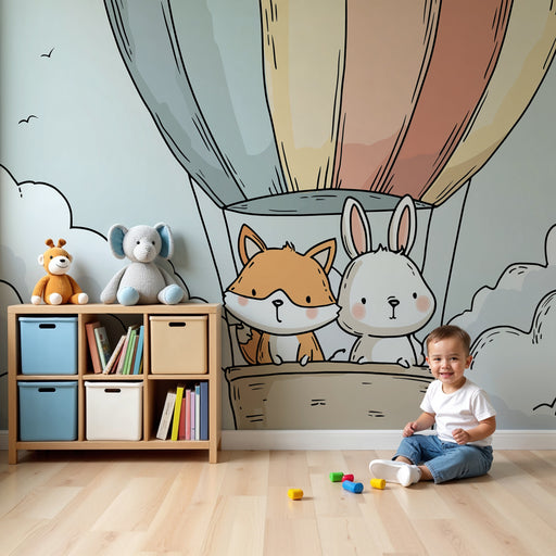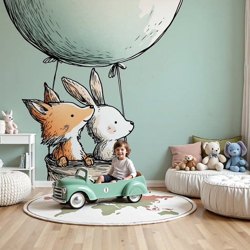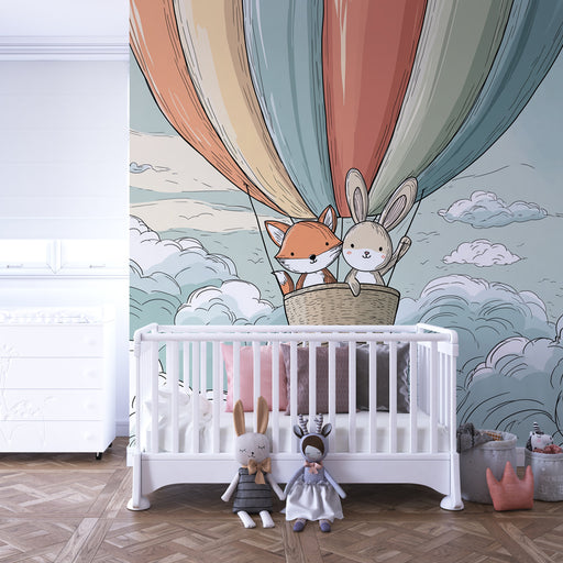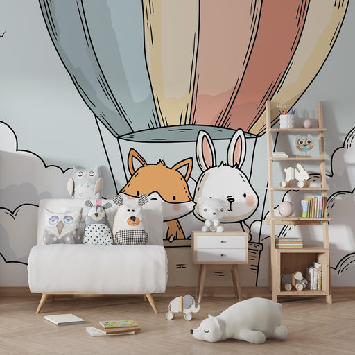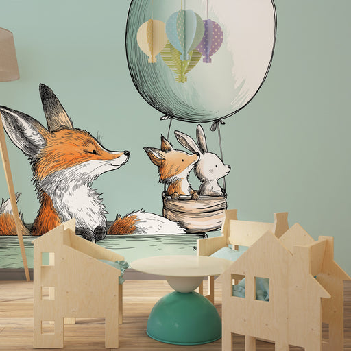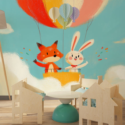 KidsWallStap in een magisch avontuur in de kamer van uw kind met dit kinderkamerbehang met een vos en een konijn in een kleurrijke luchtballon. Zwevend bov...