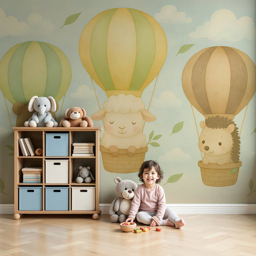 Alle gegevens bekijkenKinderkamer behang | Dieren in luchtballon in zachte lucht