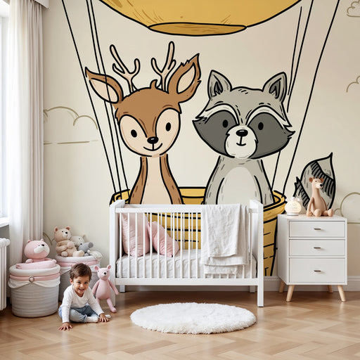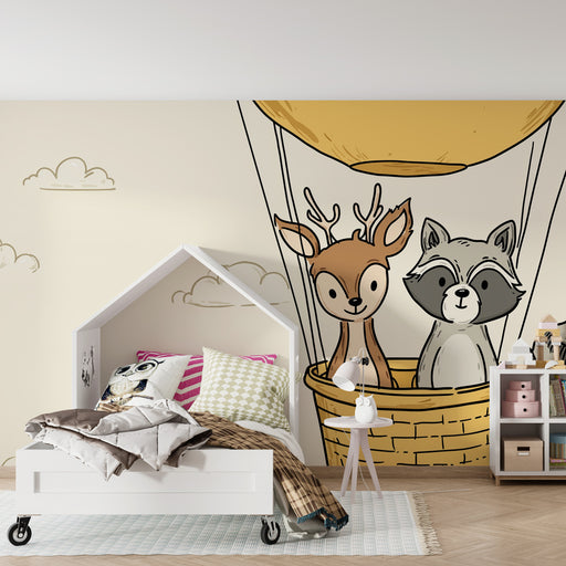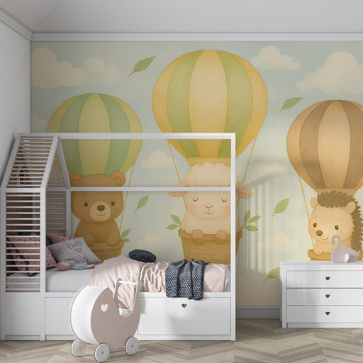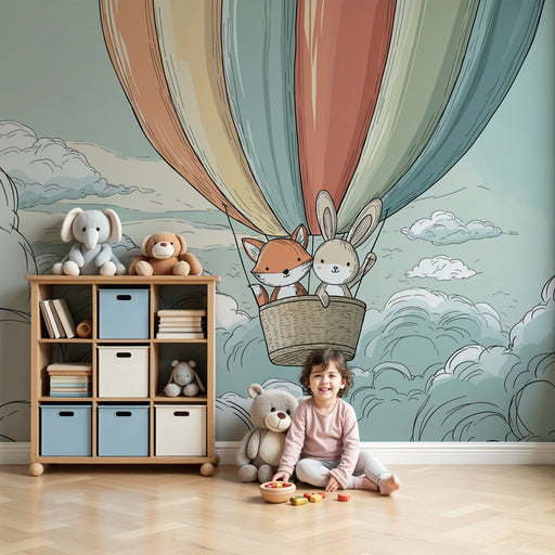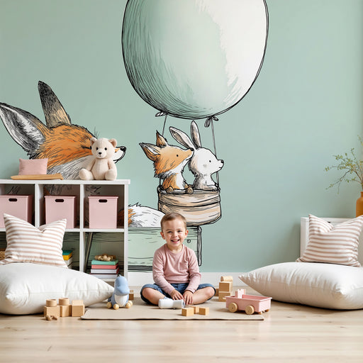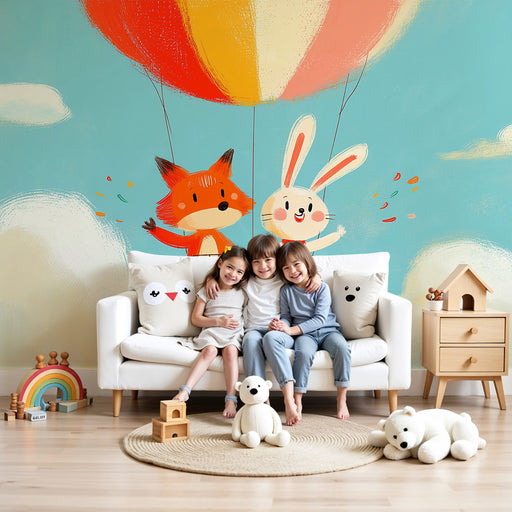KidsWallStap in een magisch avontuur met dit kinderkamerbehang met schattige dieren die in een luchtballon zweven. Een beer, een vos en een konijn stijgen ...