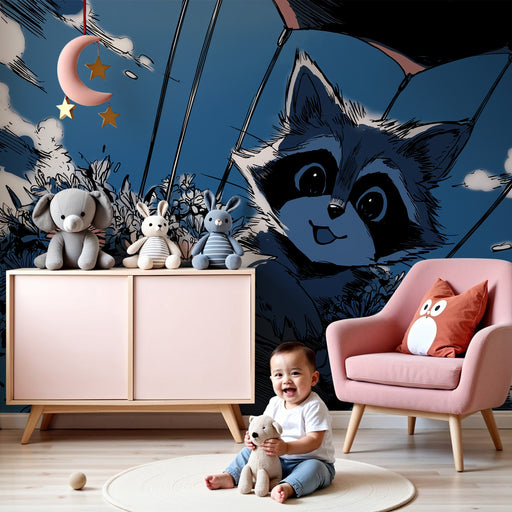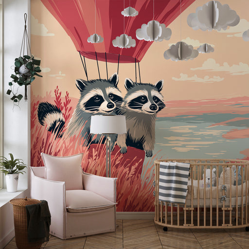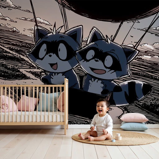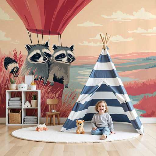 KidsWallStap aan boord voor een luchtig avontuur met dit kinderkamerbehang met ondeugende wasberen zwevend in de lucht boven een betoverend landschap. Met ...