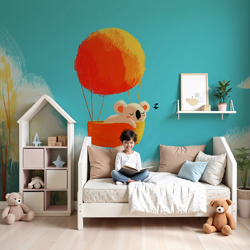 KidsWallStap in een luchtavontuur in de kamer van uw kind met dit betoverende kinderbehang. Een schattige koala zit comfortabel in zijn oranje luchtballon,...