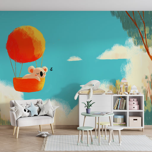 KidsWallNeem je kind mee op een denkbeeldige reis met dit kinderkamerbehang met een schattige koala die opstijgt in de lucht in een kleurrijke luchtballon....