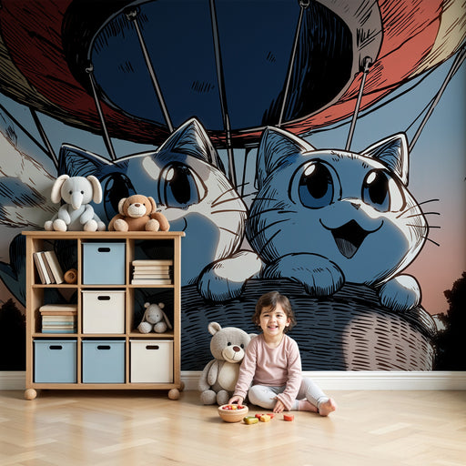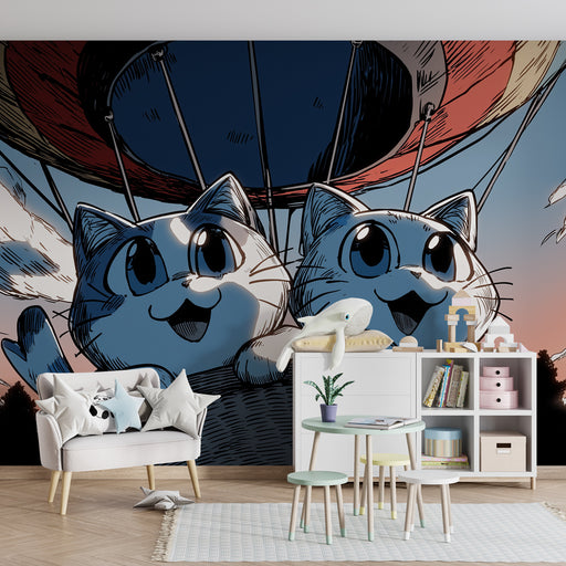 KidsWallNeem de verbeelding van uw kind mee naar nieuwe hoogten met dit levendige kinderkamerbehang, dat twee schattige katten toont die opstijgen in de lu...