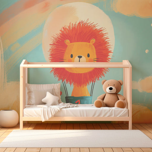 KidsWallStap in een hemels avontuur met dit charmante kinderbehang met een schattige leeuw die in een luchtballon zweeft. Tegen een achtergrond van zachte ...