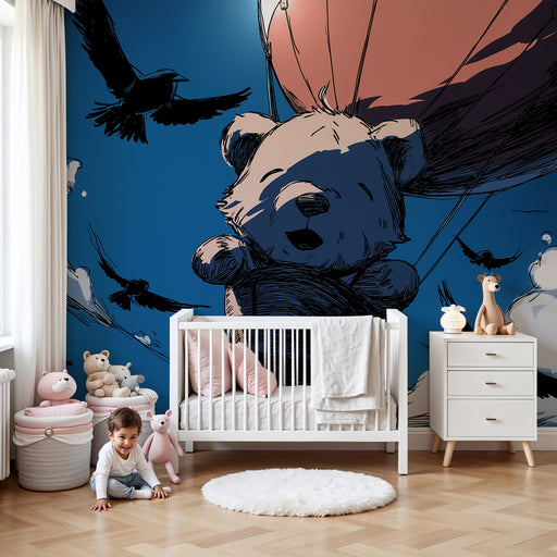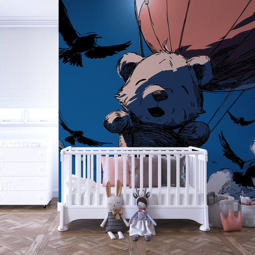 KidsWallLaat de verbeelding van uw kind reizen met dit kinderkamerbehang met een schattige teddybeer die in een luchtballon de lucht in stijgt. Tegen een a...