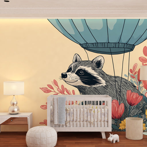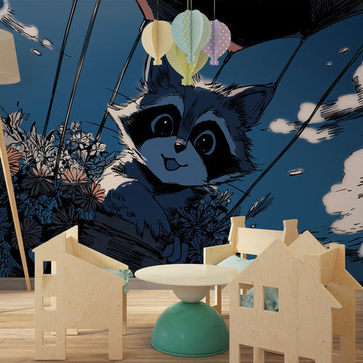 Alle gegevens bekijkenKinderkamer behang | Wasbeer in luchtballon boven de natuur