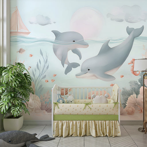 KidsWallTransformeer de kamer van je baby in een zachte en gastvrije mariene omgeving met dit babykamerbehang. Een majestueuze walvis en een vrolijke dolfi...