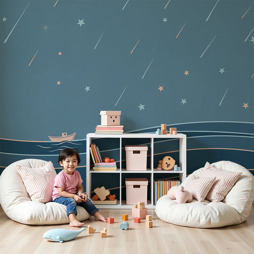 KidsWallTransformeer de kamer van uw baby tot een magische wereld met dit babykamerbehang dat een sterrennacht voorstelt. Een klein bootje vaart rustig op ...
