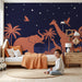 Transformeer de kamer van uw kind in een ware jungle-oase met dit fascinerende kinderbehang. Op een sterrennachtachtergrond staan majestueuze olifanten en een elegante giraffe trots tussen weelderige palmbomen, waardoor een magische en rustgevende sfeer ontstaat.