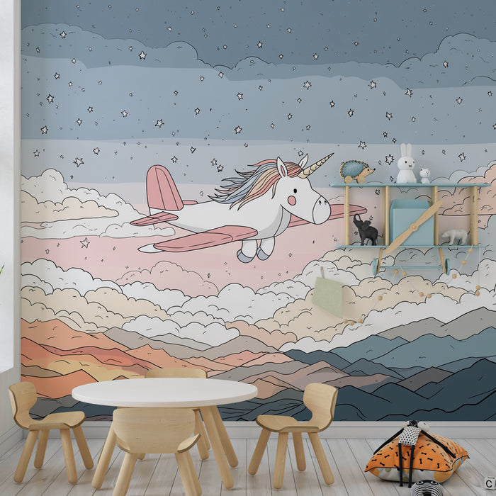 Ontwaak de verbeelding van uw kind met dit kinderkamerbehang, met een schattige eenhoorn die over een landschap van wolken en bergen vliegt. Deze betoverende scène straalt een magische sfeer uit en nodigt uit tot dromen vol avontuur en ontdekking.