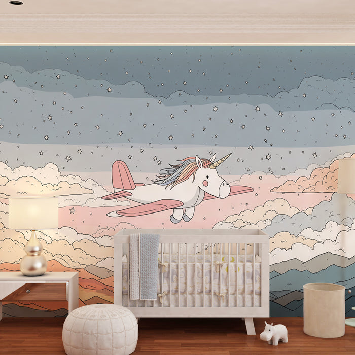 De zachte tinten roze en blauw, evenals de twinkeling van sterren die de nachtelijke hemel verlichten, creëren een rustgevende en sprookjesachtige sfeer. Elk detail, van de vrolijke silhouet van de eenhoorn tot de zachte textuur van de wolken, is zorgvuldig geïllustreerd om een veilige en inspirerende omgeving te bevorderen.