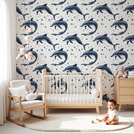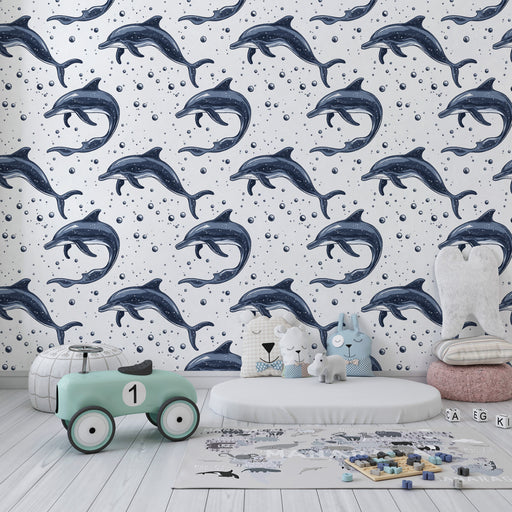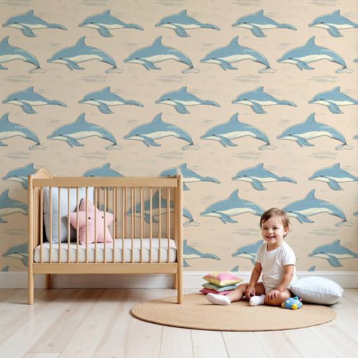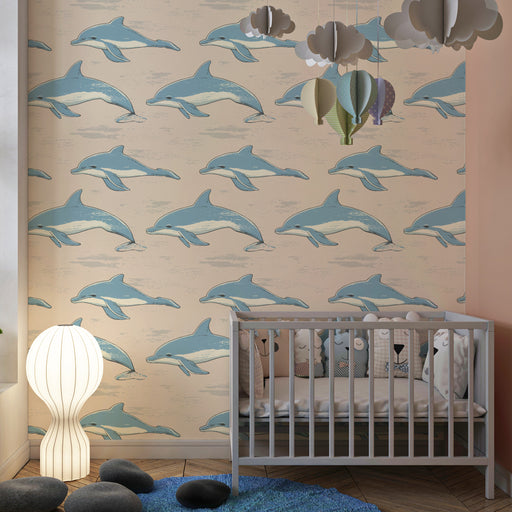KidsWallStap aan boord voor een maritiem avontuur in de kamer van uw kind met dit decoratief behang met speelse dolfijnmotieven. Op een achtergrond van zac...