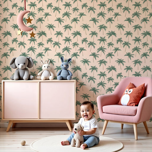KidsWallTransformeer de ruimte van uw kind met dit charmante behang, waar prachtig geïllustreerde palmbomen op een zachte pastelachtergrond staan. De tinte...