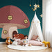 De ronde raampjes in de paddenstoel voegen een magisch detail toe, terwijl de fonkelende sterren aan de hemel een rustige en kalmerende sfeer creëren. Elk element van dit ontwerp is bedacht om de nieuwsgierigheid van je kind te prikkelen en een serene omgeving te bevorderen die goed is voor de nachtrust.