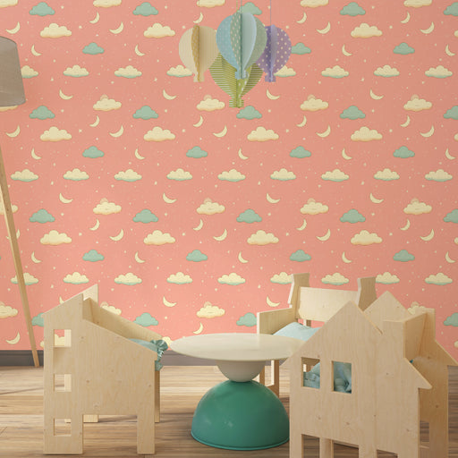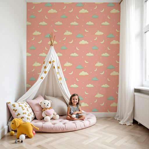 KidsWallTransformeer de kamer van uw kind in een rustgevende cocon met dit delicate behang versierd met zachte wolken en halve manen op een zachte roze ach...