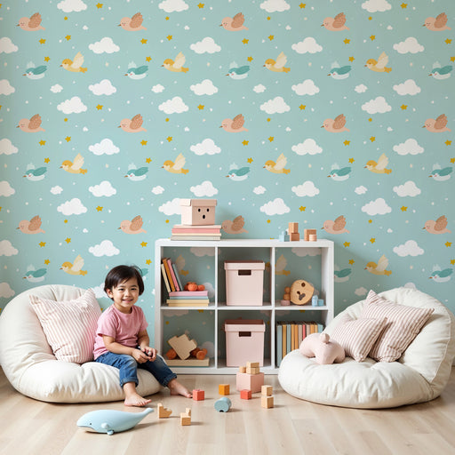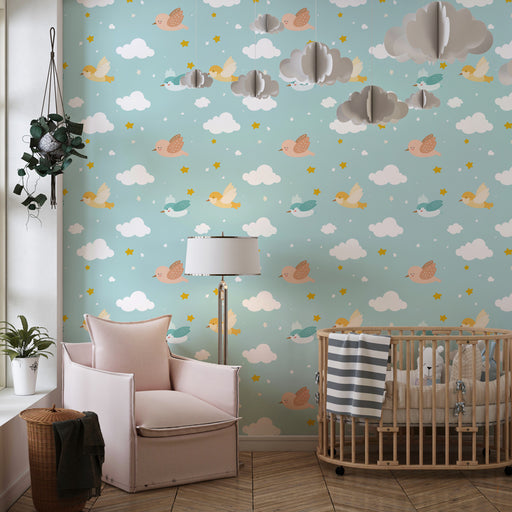 KidsWallCreëer een zachte en vrolijke ruimte voor uw kind met dit kinderkamerbehang, geïllustreerd met vrolijke vogeltjes en pluizige wolken op een rustgev...