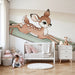 De rustgevende pastelkleuren en vloeiende patronen creëren een serene sfeer, ideaal voor rust en dagdromen. Het hert, met zijn witte vlekken en speelse blik, wekt nieuwsgierigheid op en voegt vreugde toe aan de kamer. Elk detail is zorgvuldig doordacht om de kamer om te toveren tot een echt knusse cocon.