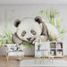 De weelderige bamboe rondom de panda voegt een natuurlijke dimensie toe aan de inrichting en benadrukt de schoonheid van Aziatische bossen. Elk detail, van de delicate vacht van de panda tot de frisse bamboebladeren, is zorgvuldig geïllustreerd en creëert een geruststellende omgeving voor de kleintjes.