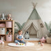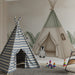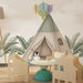 De tropiske bladene som omgir teltet legger til en beroligende grønn touch, og skaper en rolig og innbydende atmosfære. De myke nyansene av beige og grønt smelter harmonisk sammen for å tilby en avslappende ramme, perfekt for lek og hvile.