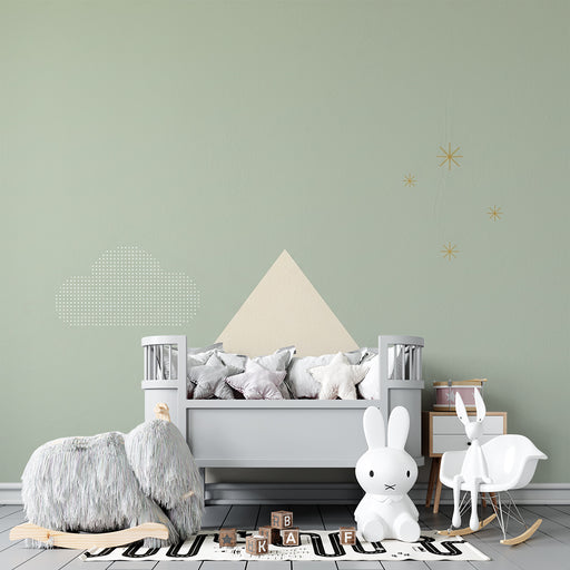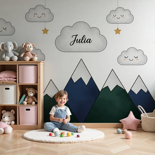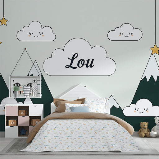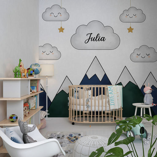 KidsWallTransformér babyrommet til et fortryllende sted med denne tapet for barn som viser beroligende fjell og smilende skyer. De myke fjellene i grønt og...