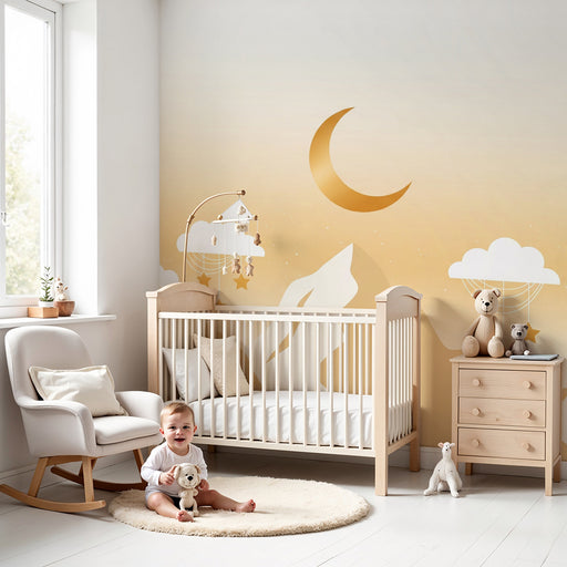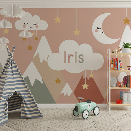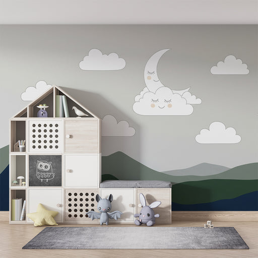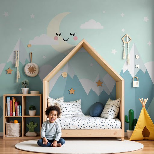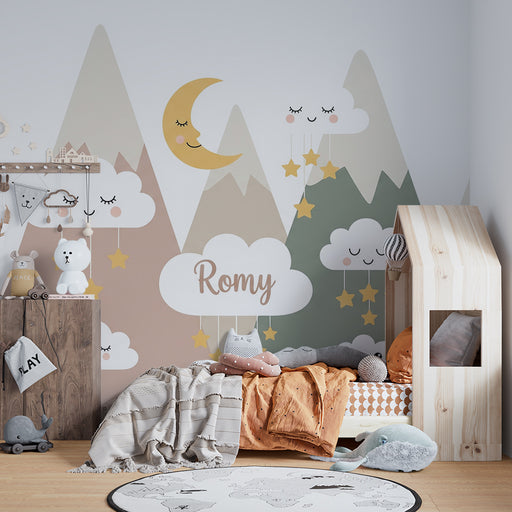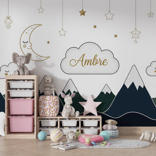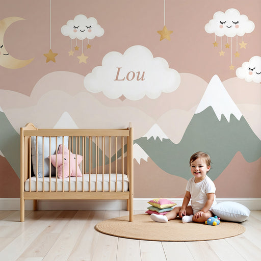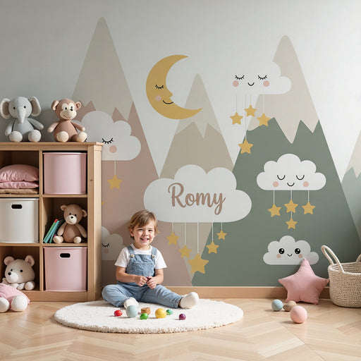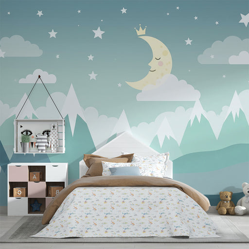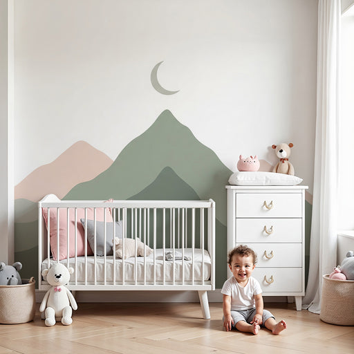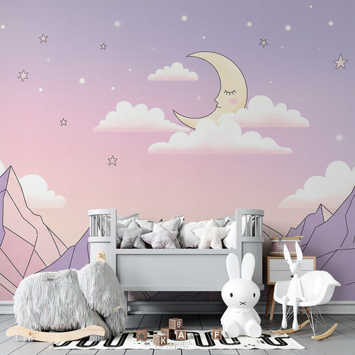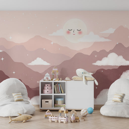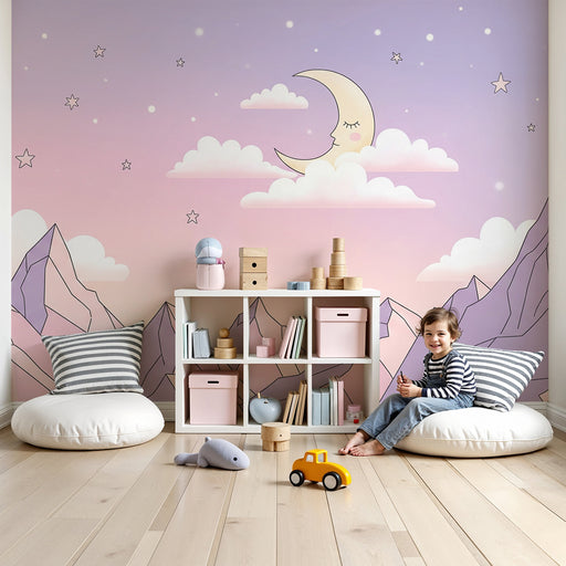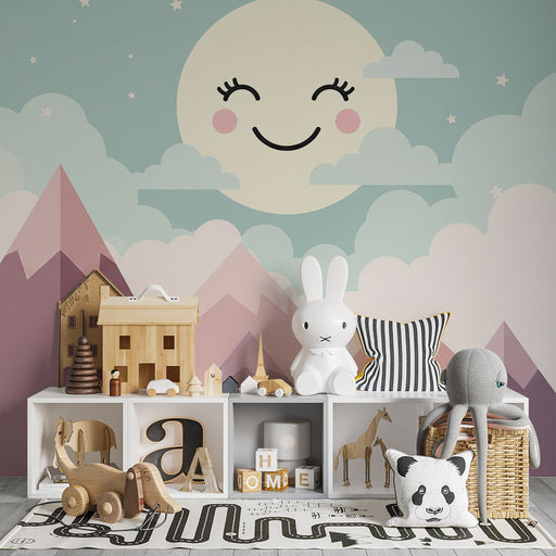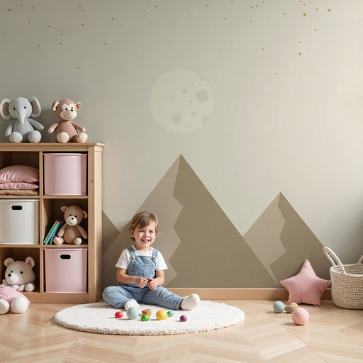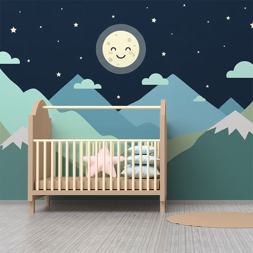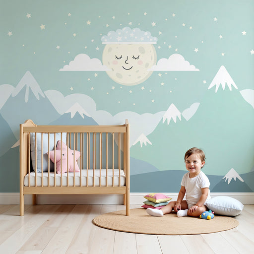 KidsWallTransformér babyrommet til en magisk plass med denne barnerom tapetet som viser stiliserte fjell under en rolig himmel. Et smilende måne ser fredel...