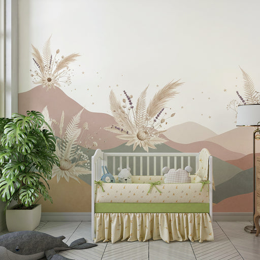 KidsWallTransformér babyrommet til en beroligende plass med denne tapetet for barnerom som viser myke fjell og delikate blomster. Pastellfarger i rosa, grø...