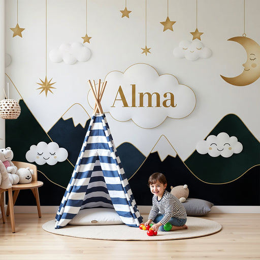 KidsWallRedesign barnerommet til babyen din til et altfor søtt sted med denne tapetet for barnerom som viser myke fjell under en stjernehimmel. Den smilend...
