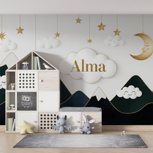 Vis alle detaljerTapet barnerom | Myke fjell med skyer og gullstjerner