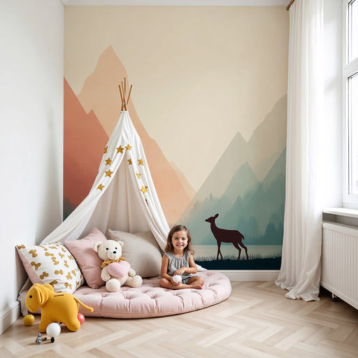Vis alle detaljerTapet barnerom | Myke fjell og hjort i et avslappende landskap