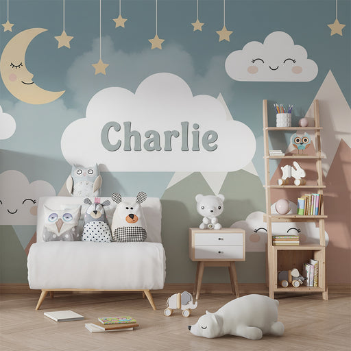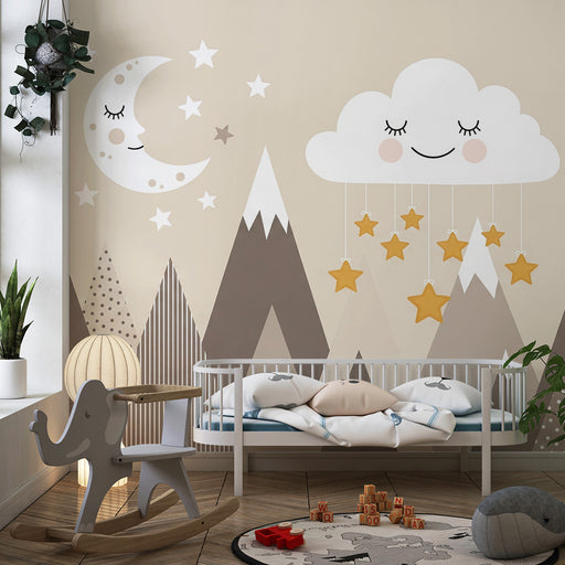 Vis alle detaljerTapet barnerom | Myke fjell og smilende skyer under en stjernehimmel