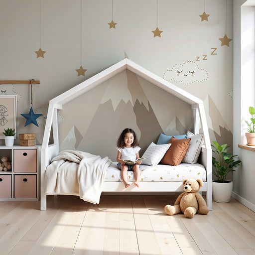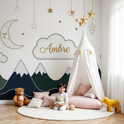 KidsWallRedesign barnerommet til en altfor søt plass med denne tapetet for barnerom som illustrerer majestetiske fjell under en stjernehimmel. Et smilende ...