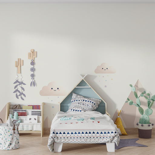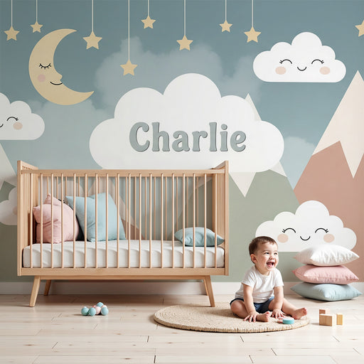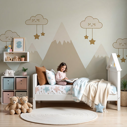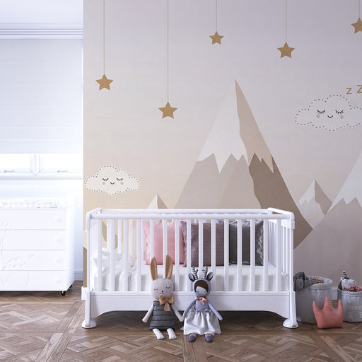KidsWallRedesign barnerommet til babyen din til et altfor søtt sted med denne tapetet for barnerom delikat, som illustrerer beroligende fjell og glade skye...