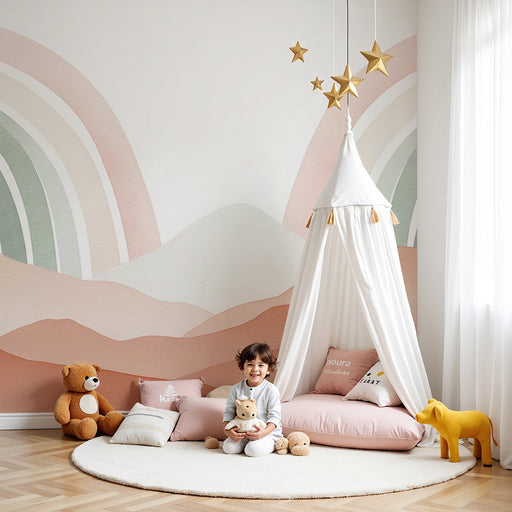 KidsWallTransformér babyrommet til en oase av fred med denne tapeten for barnerom i myke pastellfarger. Stiliserte fjell reiser seg majestetisk, prydet med...
