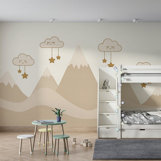 KidsWallRedesign barnerommet til en altfor søt plass med denne barnerom tapet som viser myke fjell og smilende skyer. De beroligende nyansene av beige og k...