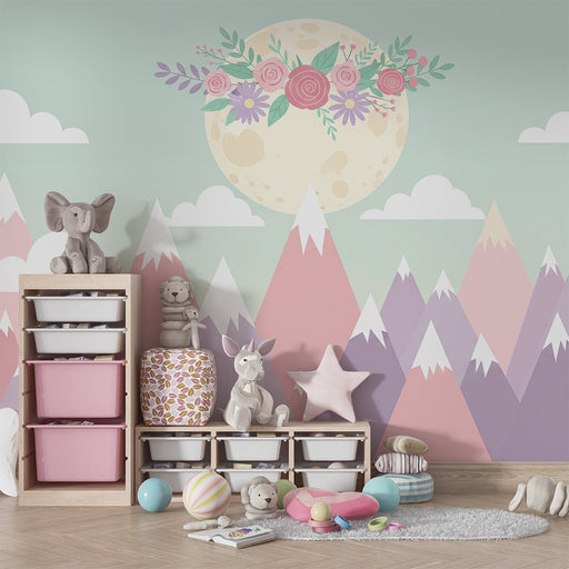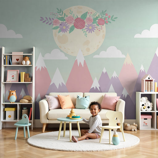 Vis alle detaljerTapet barnerom | Pastellfjell og blomstrende måne