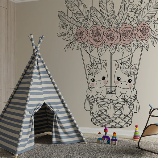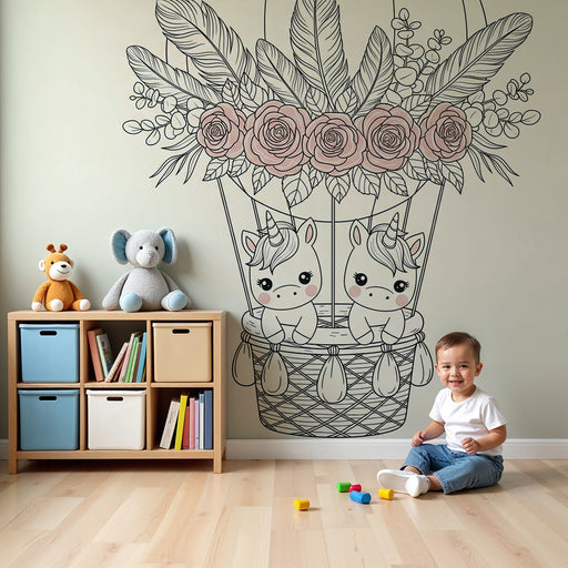 KidsWallStig ombord på en eventyrlig reise med denne tapetet for barnerommet som viser en sjarmerende luftballong dekorert med vakre roser og delikate blad...