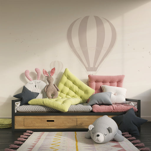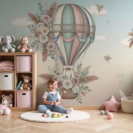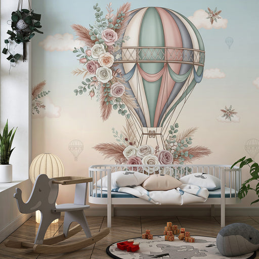 KidsWallStig om bord på en fortryllende reise inn i babyens rom med denne barnerom tapetet som viser en vakker luftballong dekorert med delikate blomster. ...