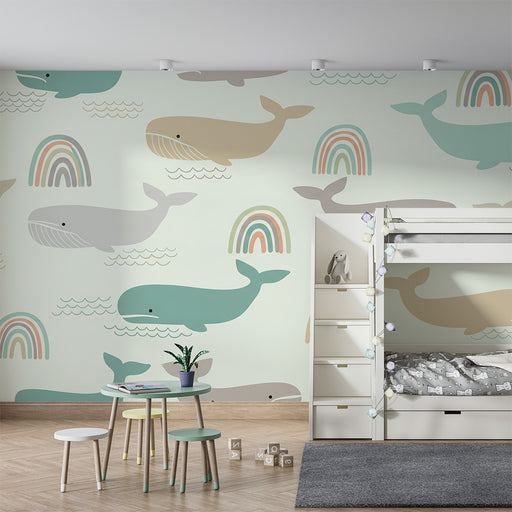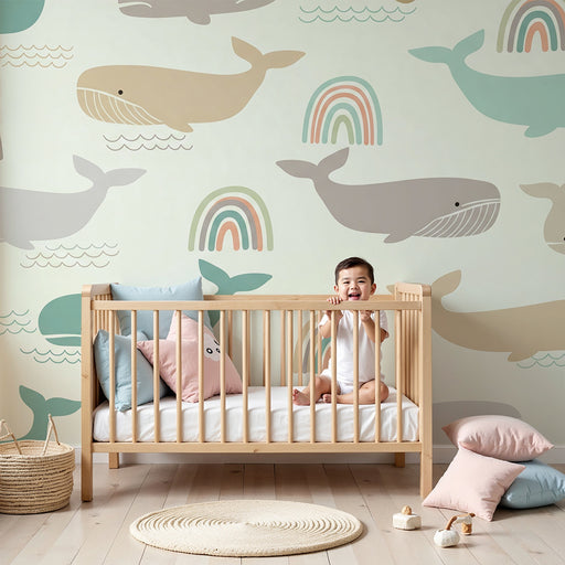KidsWallTransformér babyrommet til en fortryllende havverden med denne tapetet for barn dekorert med sjarmerende hvaler og regnbuer. Hver hval, i myke tone...