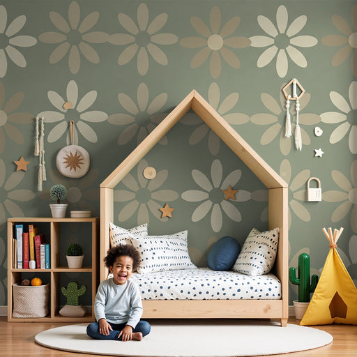 KidsWallRedesign barnerommet til en altfor søt plass med denne tapetet for barnerom prydet med delikate blomster. Tusenfryd-mønstrene i myke nyanser av bei...