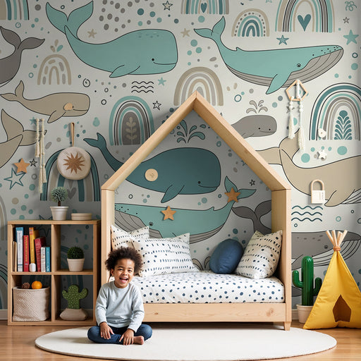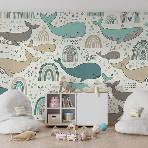 KidsWallDykk ned i en fortryllende havverden med denne tapetet for barnerom prydet med vennlige hvaler og fargerike regnbuer. Hver hval, med sitt rampete s...