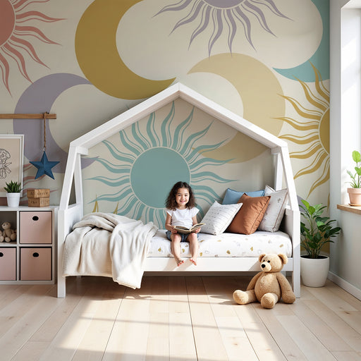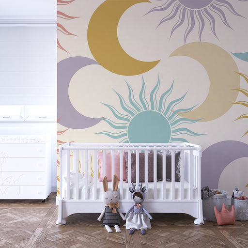 KidsWallTransformér babyrommet med denne tapetet for barn med fortryllende motiver av soler og måner. De gyldne og pastellfargede solstrålene smelter harmo...
