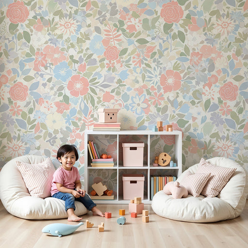 KidsWallTransformér barnerommet til en fortryllet hage med denne barnerom tapet prydet med delikate blomstermotiver. Blomstene i pastellfarger, fra myk ros...