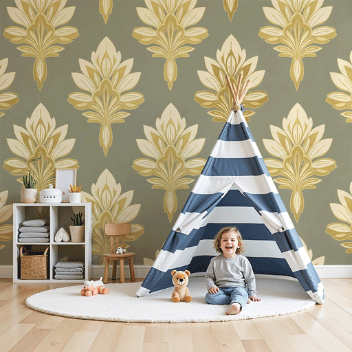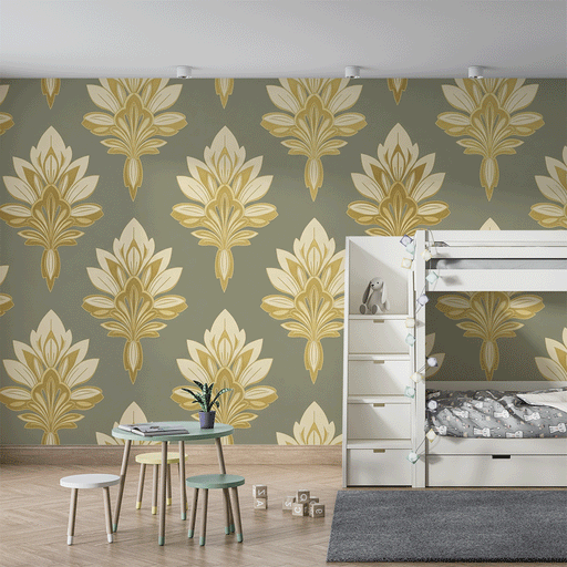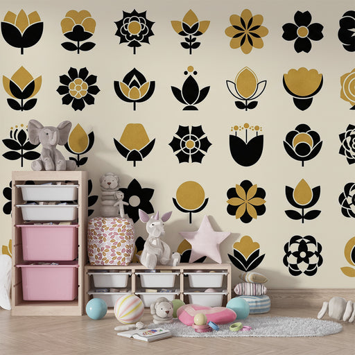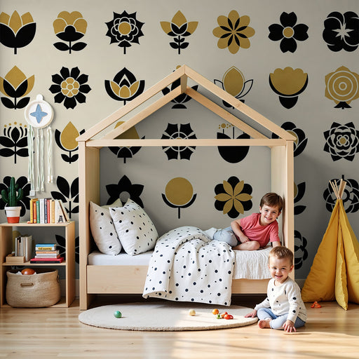 KidsWallTransformér babyrommet med denne tapetet for barnerom med moderne blomstermotiver. Stiliserte blomster i svart og gull gir en elegant og sofistiker...