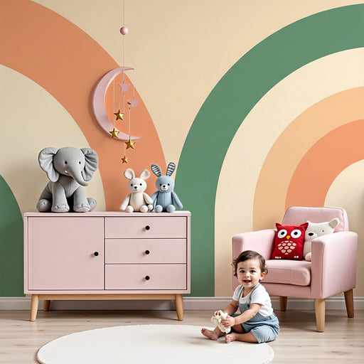 KidsWallTransformér barnerommet med denne tapeten for barnerom med beroligende geometriske mønstre. Fargede buer i grønne, fersken og kremfarger skaper en ...