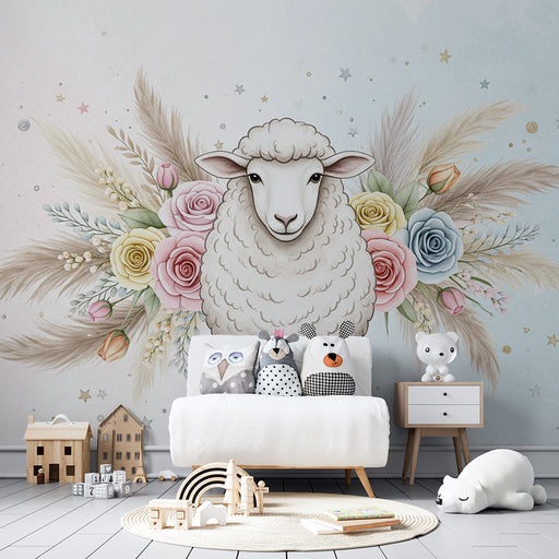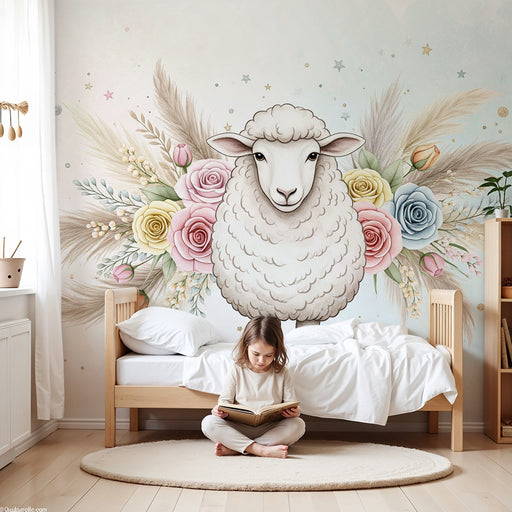 KidsWallTransformér barnerommet til en myk oase med denne barnerom tapet som viser en sjarmerende sau midt i en bukett med delikate blomster. De pastellros...