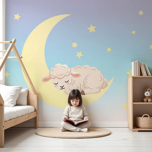 KidsWallTransformér barnerommet til en ekte kosekrok med denne tapeten for barnerom som viser et søtt, sovende lam på en måne. Omringet av skinnende stjern...