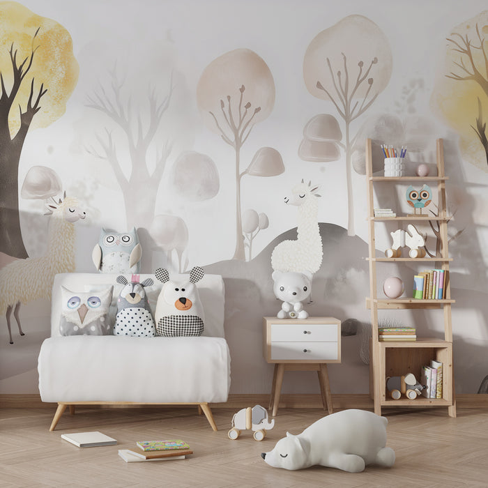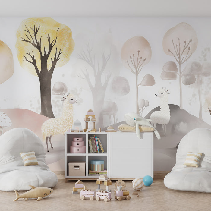 Tapet barnerom | Fortryllet skog med lamaer og pastellsopp